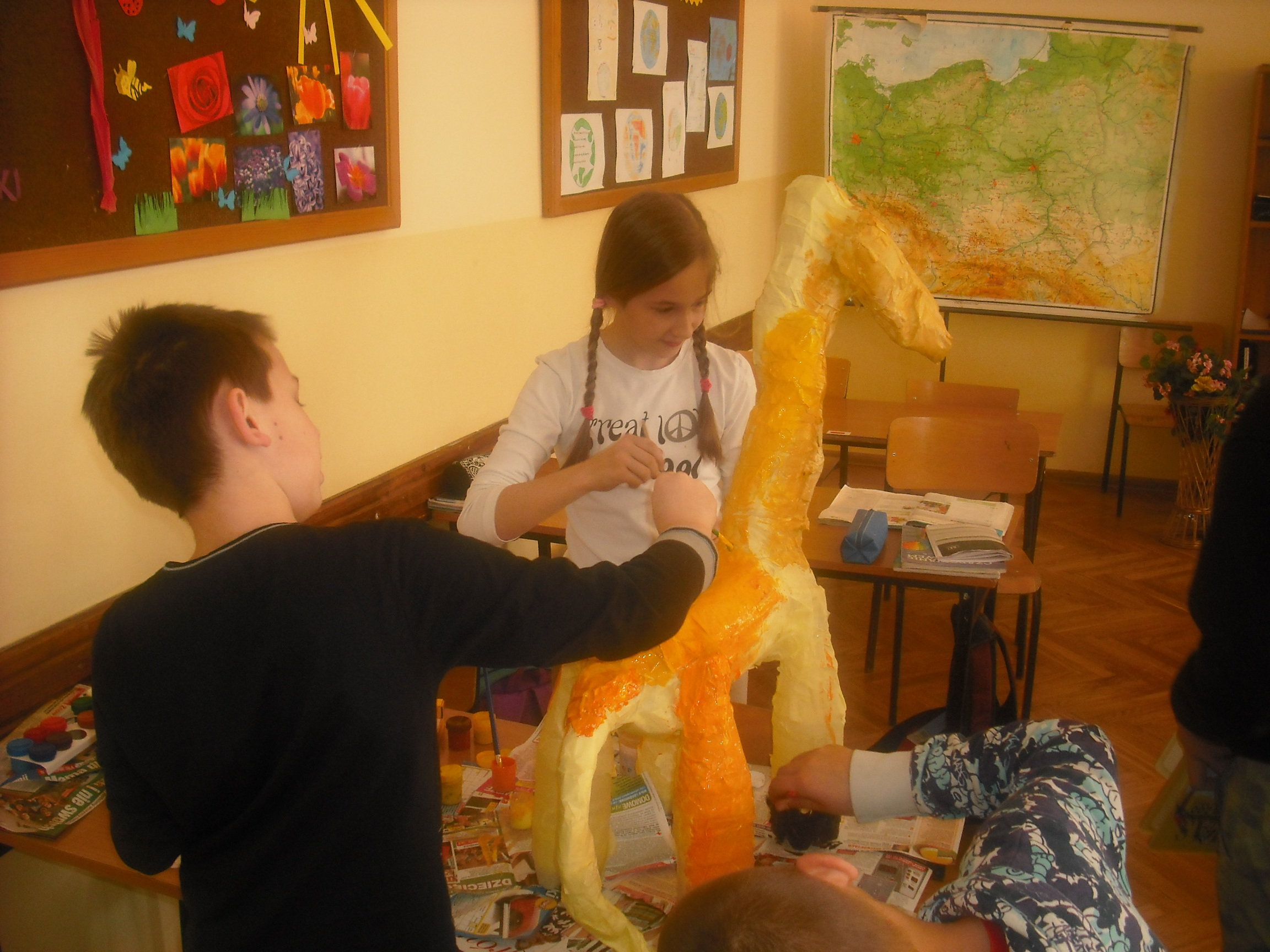 Zajęcia plastyczne w klasie piątej zakończyły się dużą wystawą na dolnym korytarzu. Mamy w szkole ekologiczne ZOO. Zwierzęta, które można podziwiać powstały z materiałów wtórnych, typu butelki pet, folia, taśma. Uczniowie pracowali znakomicie. Właściwie nie było takiej osoby, która by nie chciała mieć udziału w tym przedsięwzięciu. Atmosferę przy pracy najlepiej oddadzą zdjęcia.