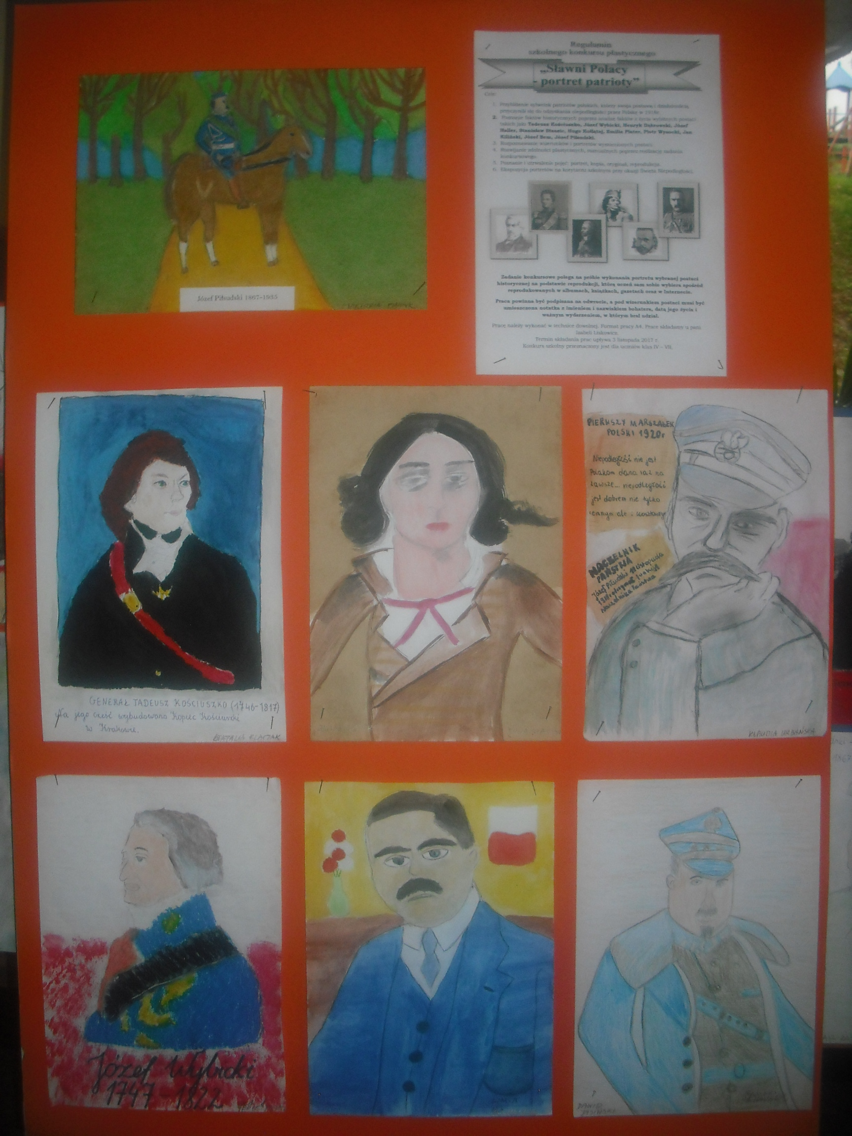 W konkursie wzięli udział wszyscy uczniowie klas IV – VII, tworząc w technikach rysunkowych. Powstały bardzo interesujące portrety wybitnych polskich patriotów, które możemy podziwiać na parterze szkolnym. Celem konkursu było nie tylko rozwijanie umiejętności plastycznych, ale również poszerzanie wiedzy historycznej.